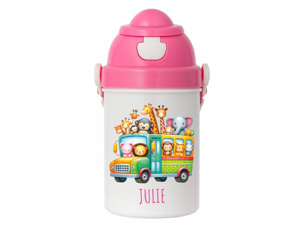 Detská fľaša s veselým motívom autobusu plného zvieratiek. Praktická do škôlky, na výlety aj ako originálny darček pre deti.
