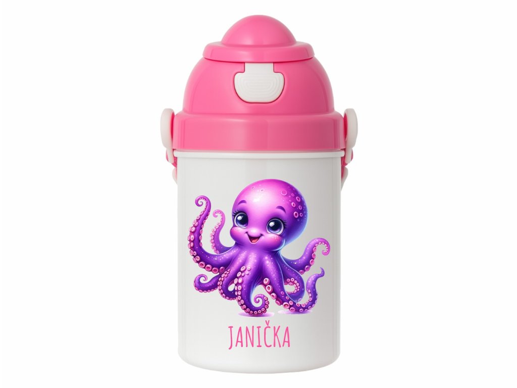 Detská fľaša s potlačou chobotnice v akvarelovom štýle. Praktická do škôlky aj na výlety, skvelý darček pre malých objaviteľov oceánu.