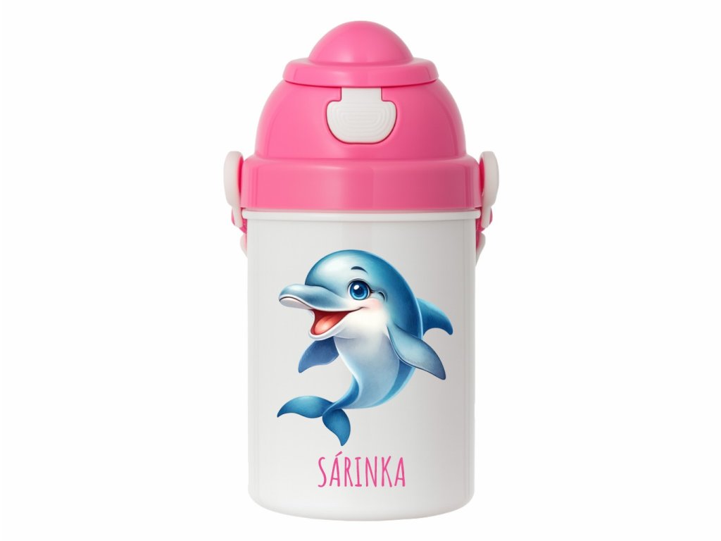 Veselá detská fľaša s akvarelovým motívom delfína. Ideálna do škôlky, na výlety alebo ako darček pre deti, ktoré milujú more a zvieratá.