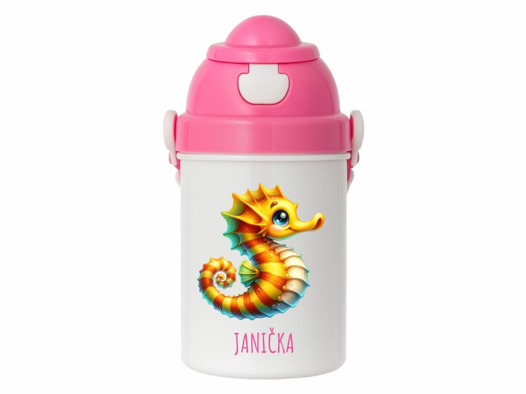 Jemná detská fľaša s akvarelovým motívom morského koníka. Ideálna do škôlky, na výlety aj ako krásny darček pre malých milovníkov oceánu.