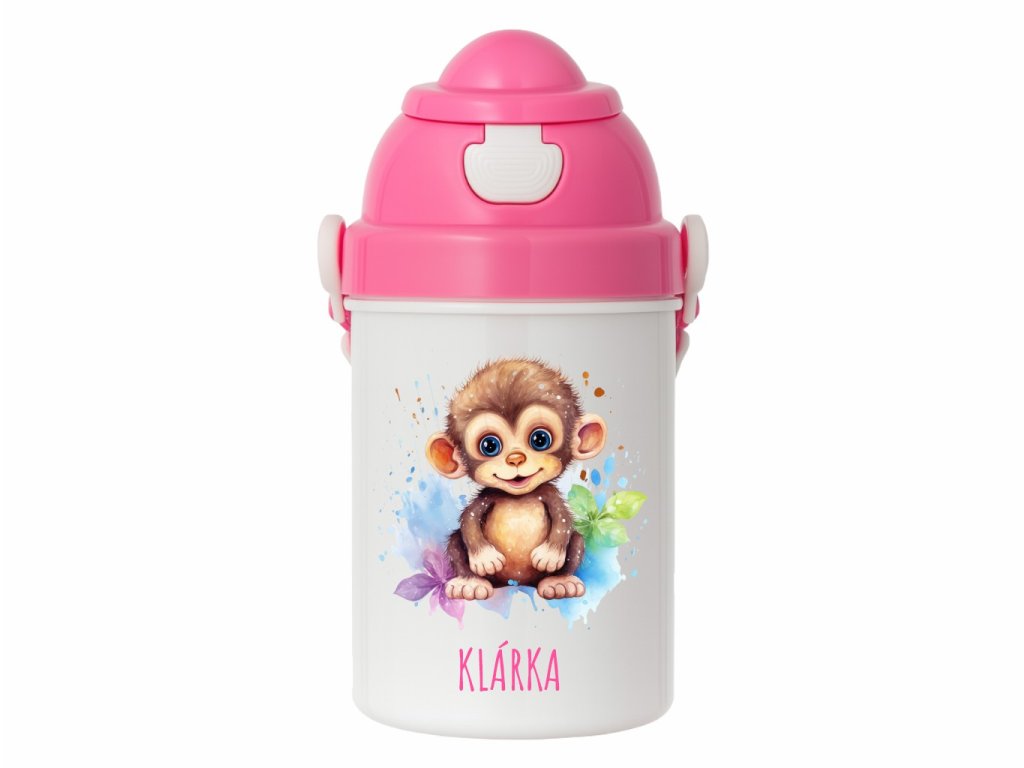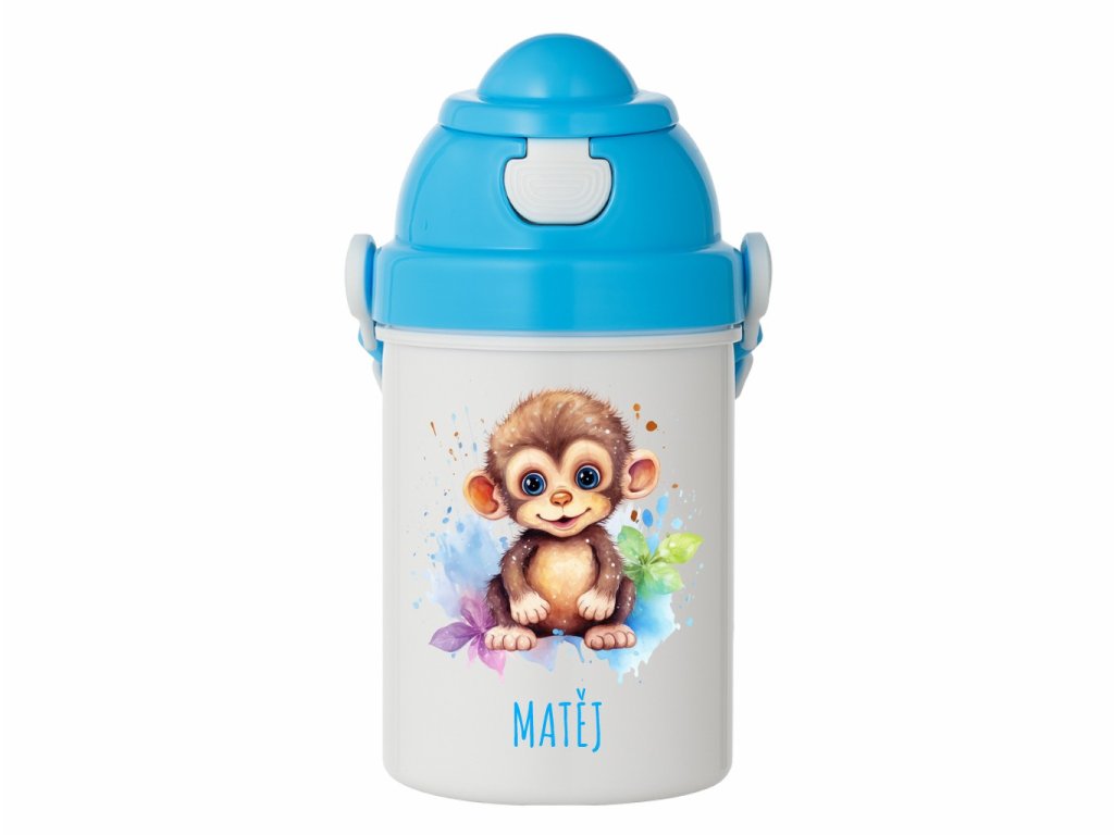 Veselá detská fľaša s akvarelovým motívom opičky. Praktická do škôlky, na výlety aj ako originálny darček pre malých neposedných dobrodruhov.