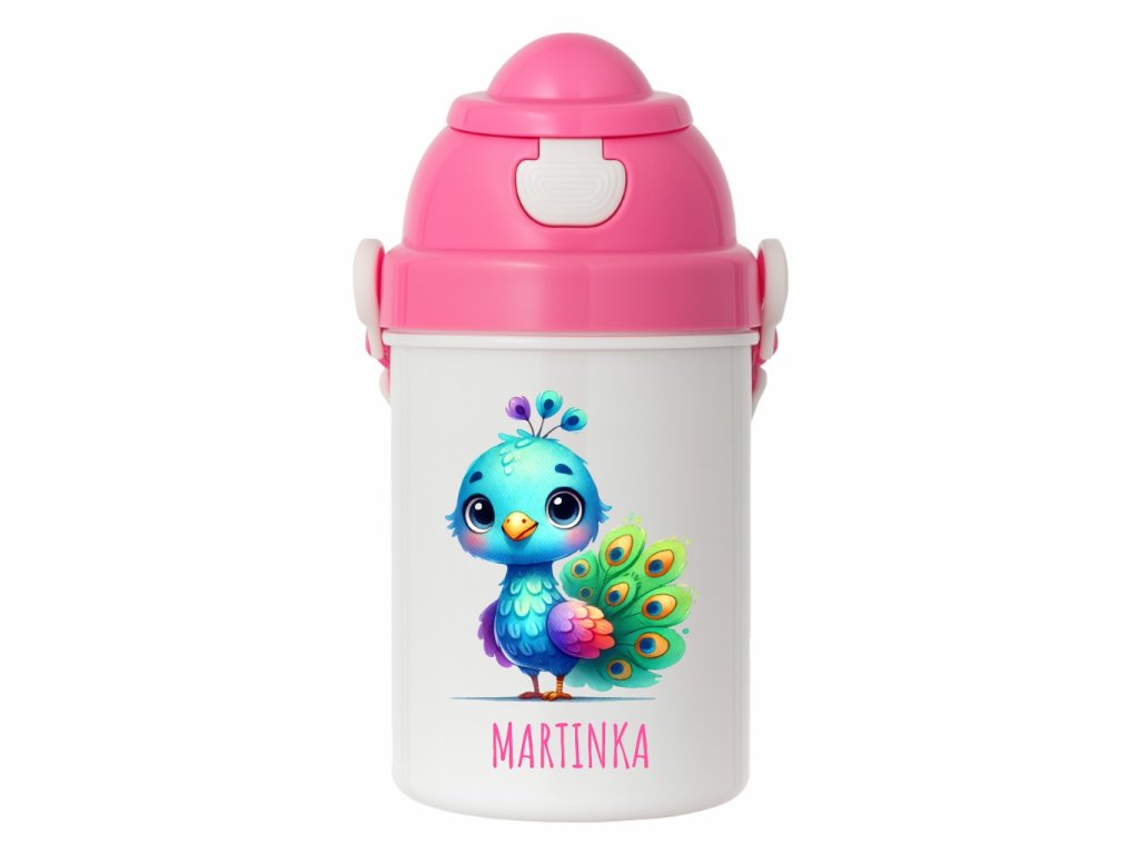 Detská fľaša s potlačou páva je ideálna do škôlky, na výlety aj ako darček. Ľahká, odolná a s elegantným motívom.