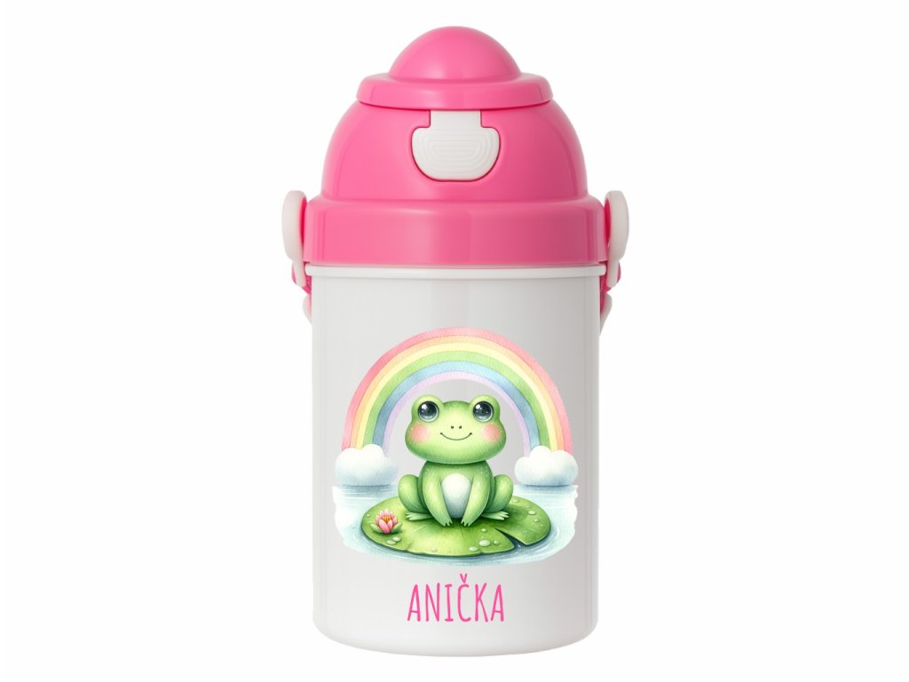 Roztomilá detská fľaša s potlačou žabky na lekne a dúhy. Skvelá voľba do škôlky, na výlety aj ako darček pre malé deti.