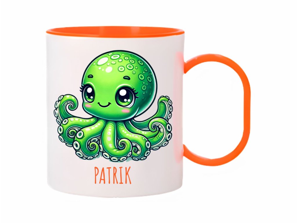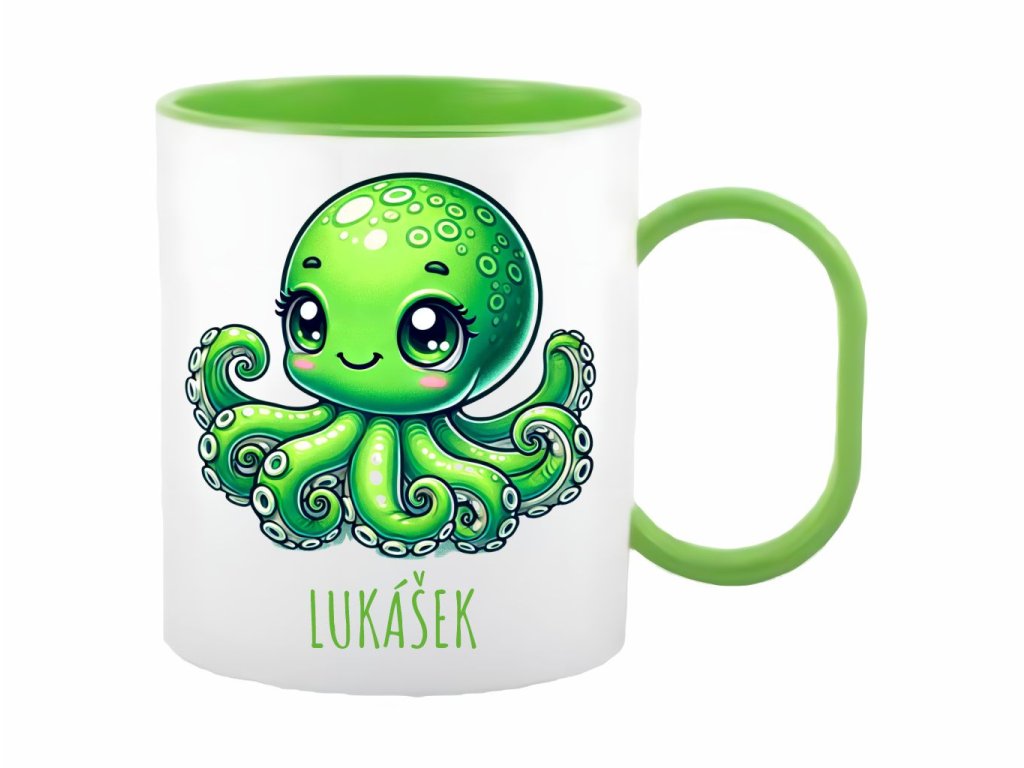 Roztomilý plastový hrnček s akvarelovým motívom zelenej chobotničky. Ideálny pre deti, vďaka odolnému materiálu a praktickému ušku.