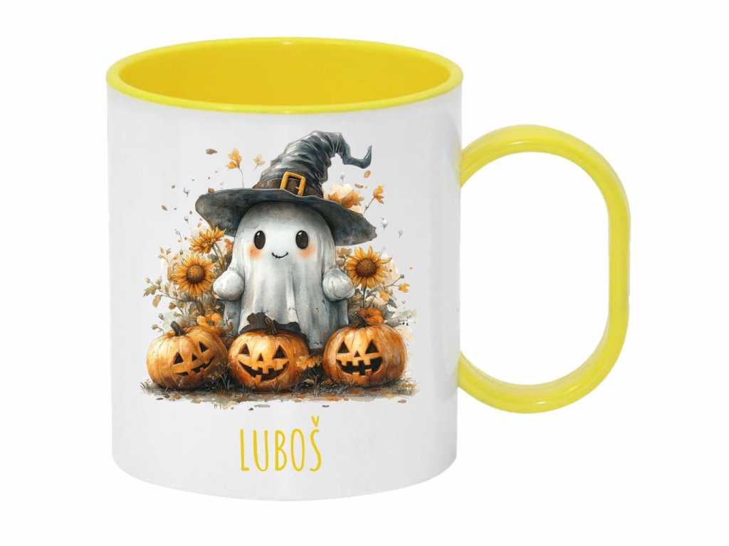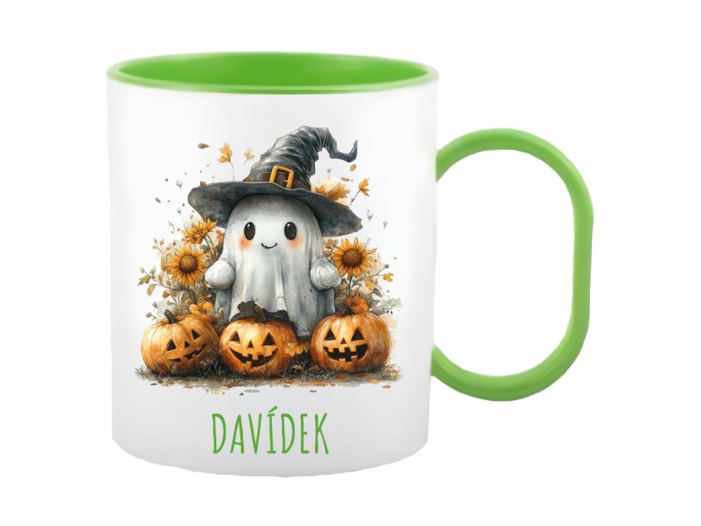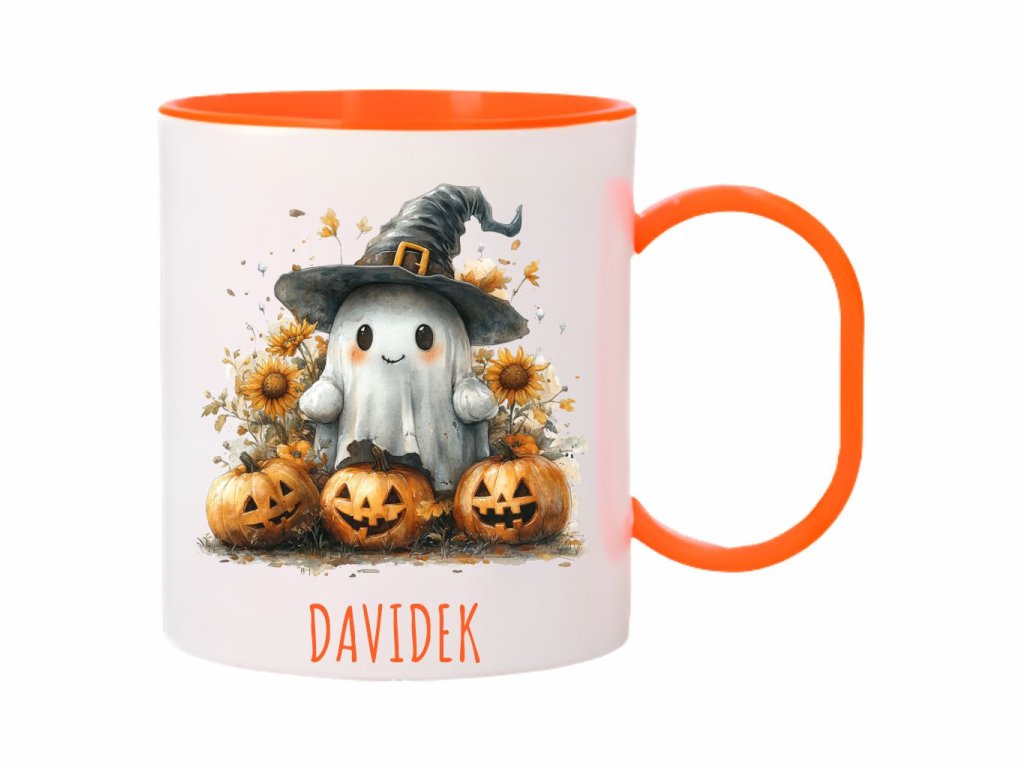 Veselý plastový hrnček s motívom ducha, tekvíc a slnečníc, ideálny darček so menom na Halloween. Perfektný pre deti, ktoré milujú farebné a hravé motívy.