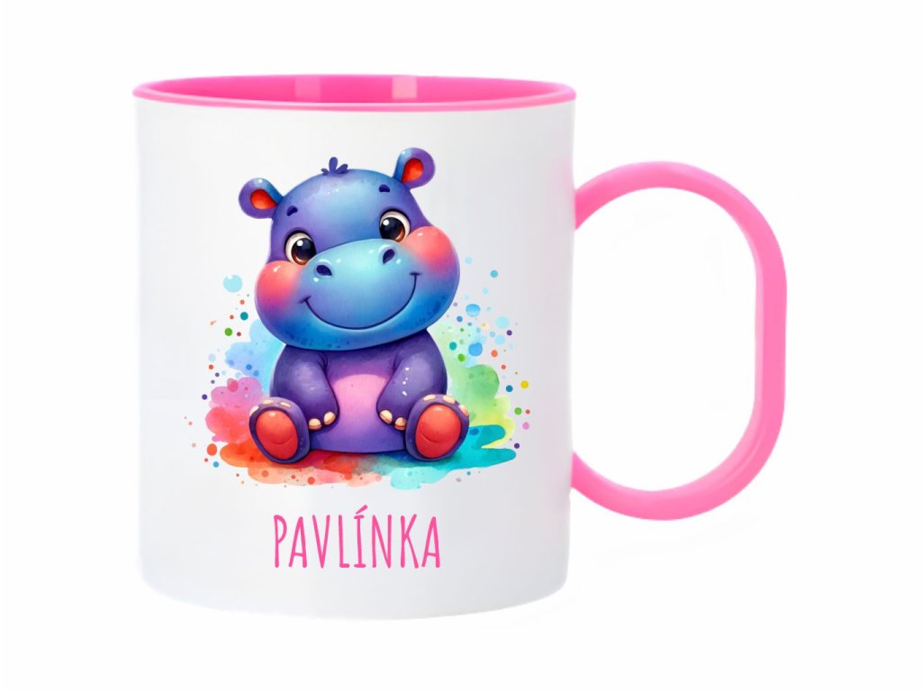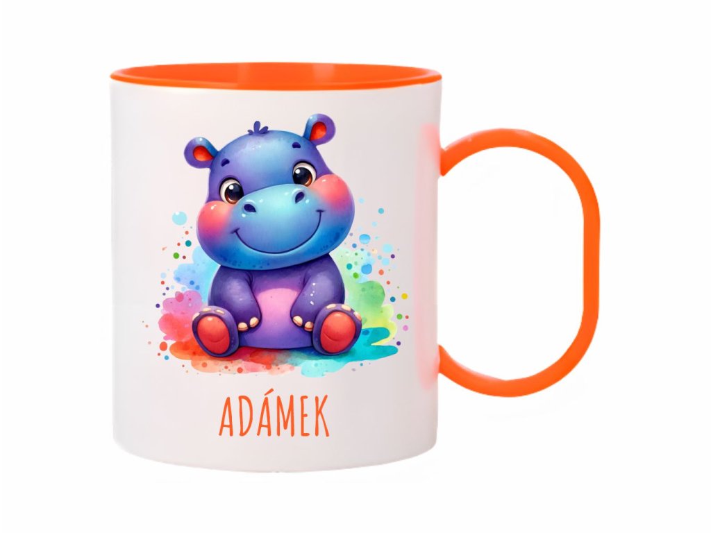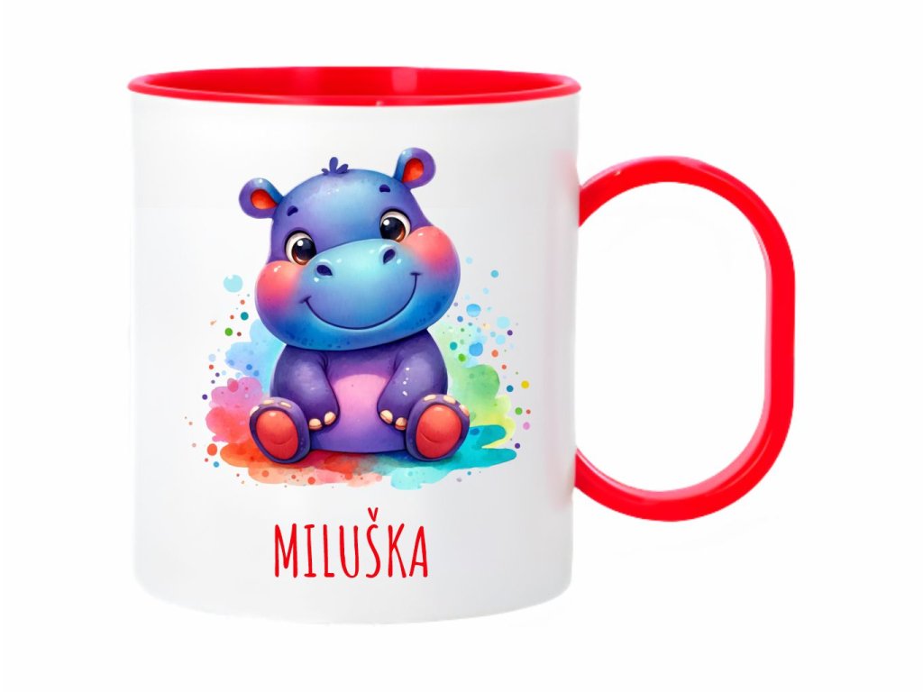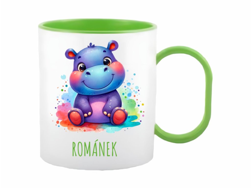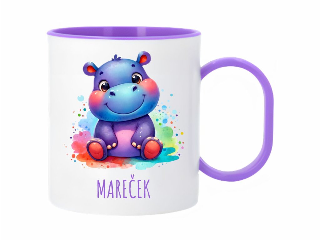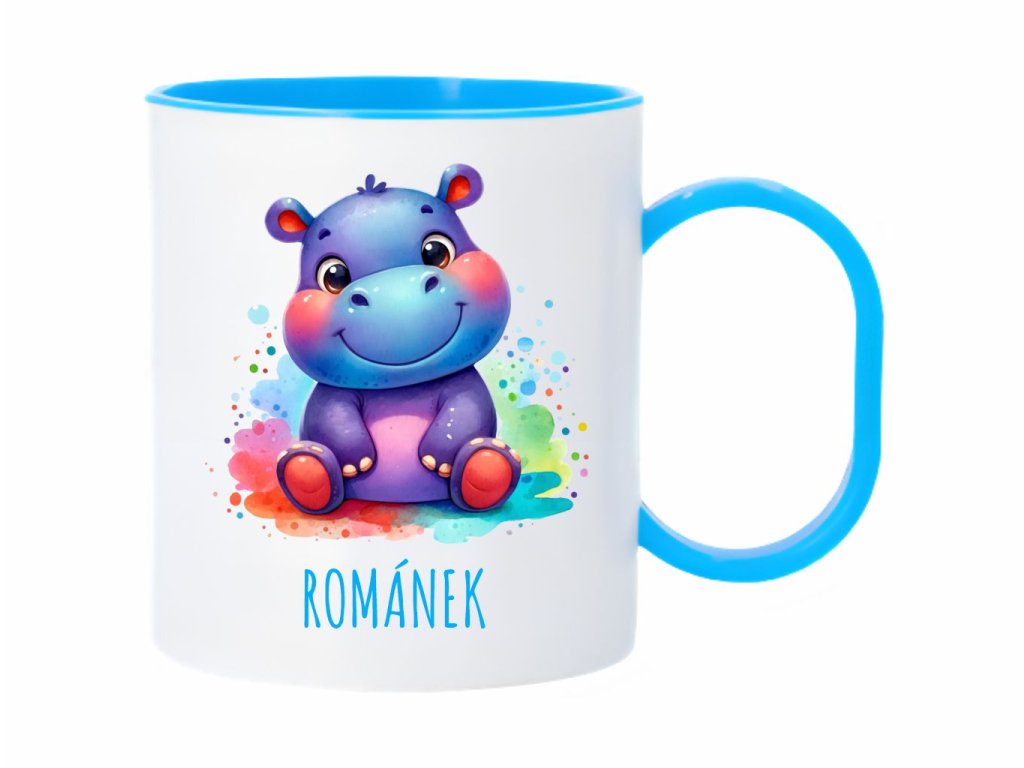 Veselý plastový hrnček s motívom hrošíka v akvarelovom štýle, ideálny pre deti. Ľahký, odolný a praktický na každodenné použitie.