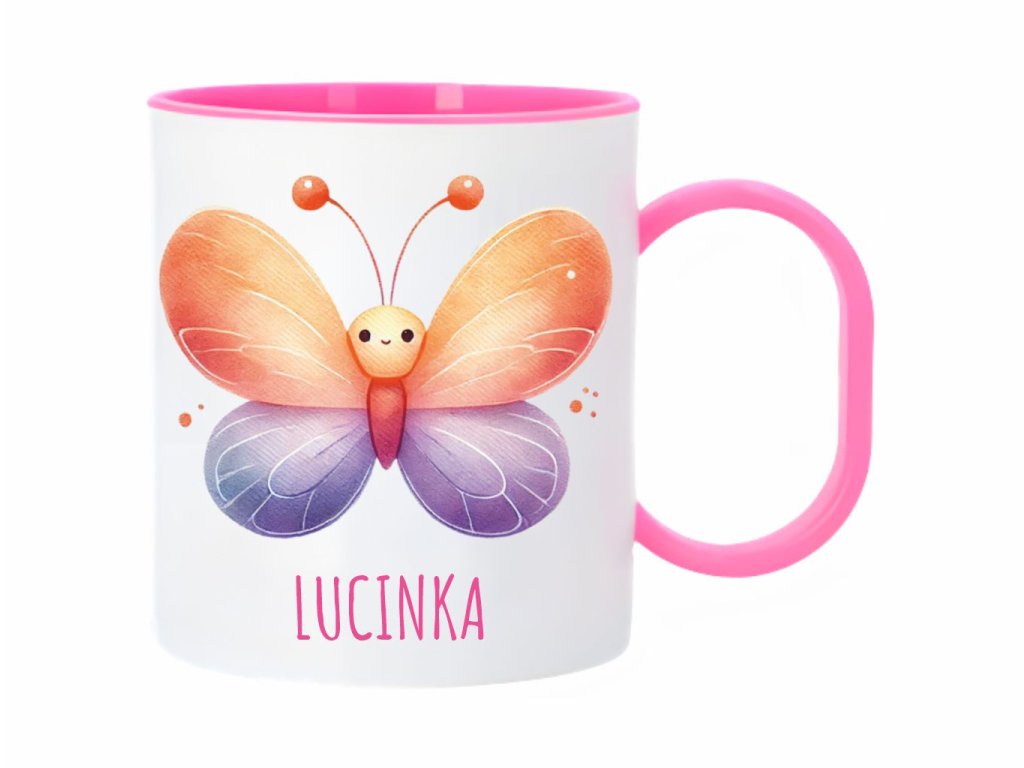 Krásny plastový hrnček s motívom farebného motýľa, ktorý poteší každé dieťa! Bezpečný, ľahký a možné ho personalizovať menom, ideálny na každodenné pitie.