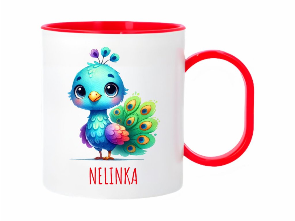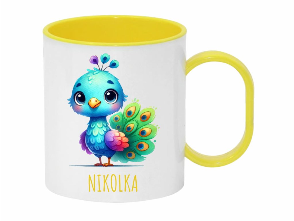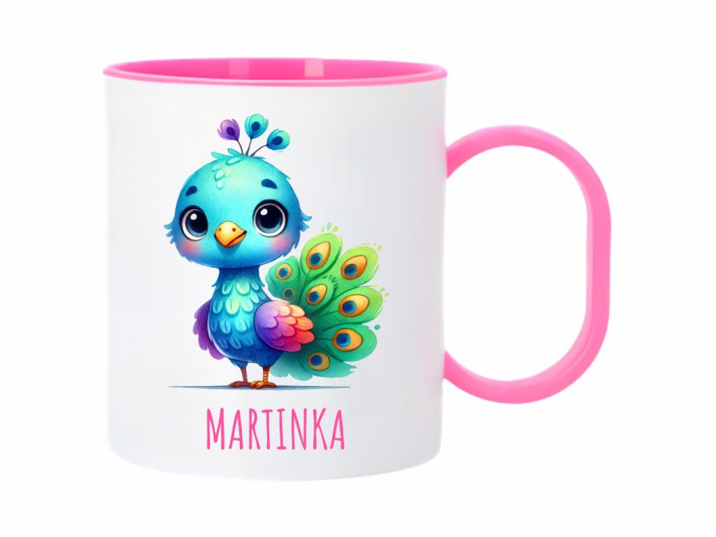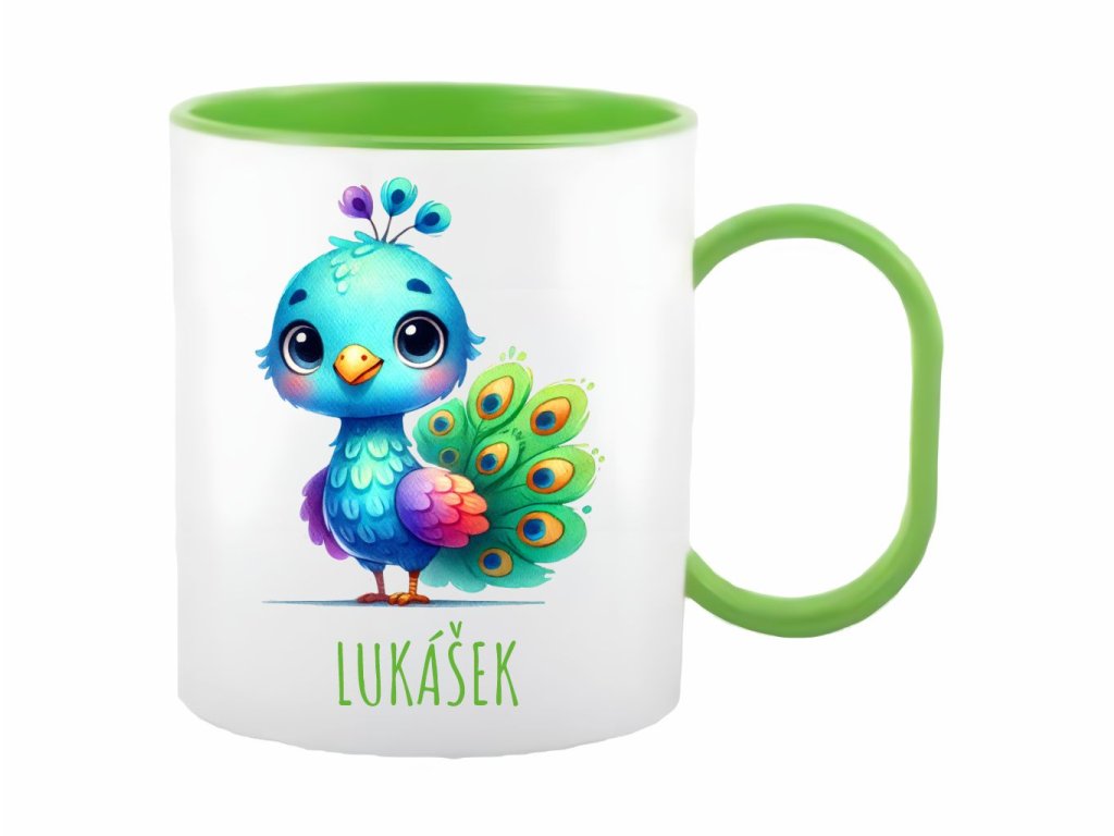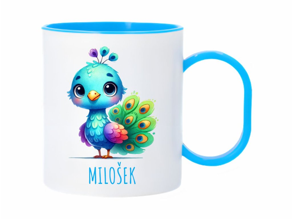 Roztomilý plastový hrnček s motívom páva v akvarelovom štýle, ideálny pre deti. Ľahký, odolný a praktický na každodenné použitie.