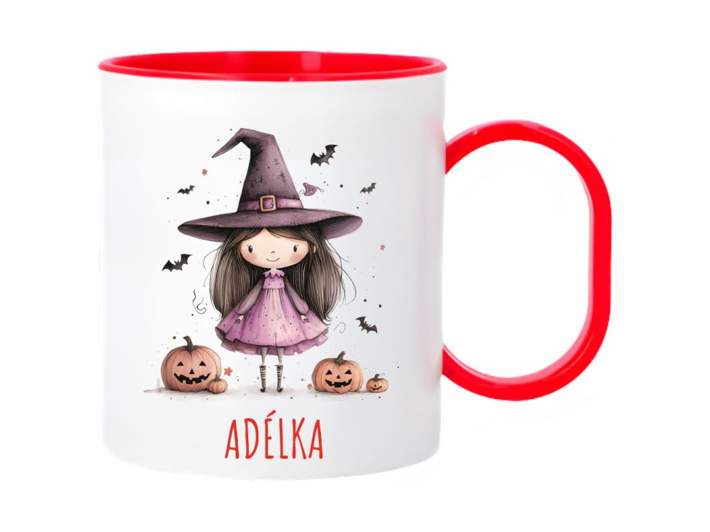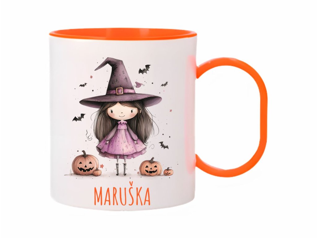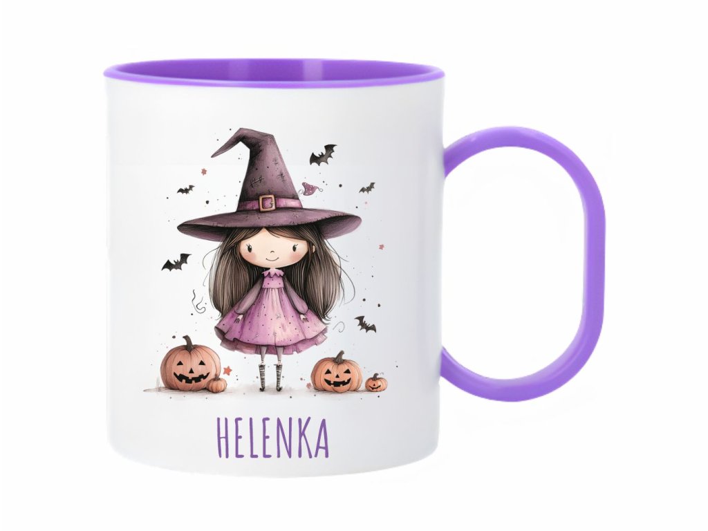 Štýlový plastový hrnček s motívom roztomilej čarodejnice a tekvíc. Perfektný personalizovaný darček pre deti na Halloween, ktorý očarí svojím hravým dizajnom.
