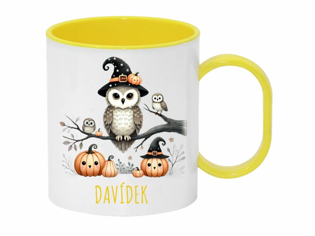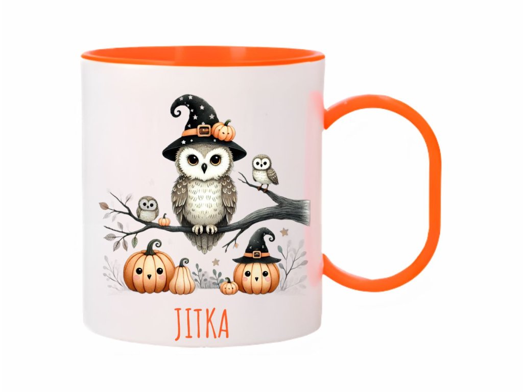 Roztomilý plastový hrnček s motívom sovičiek na vetve a tekvíc. Ideálny personalizovaný darček na Halloween pre deti, ktoré zbožňujú magické a hravé motívy.