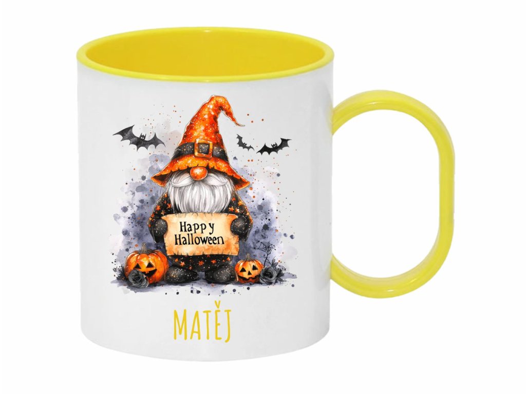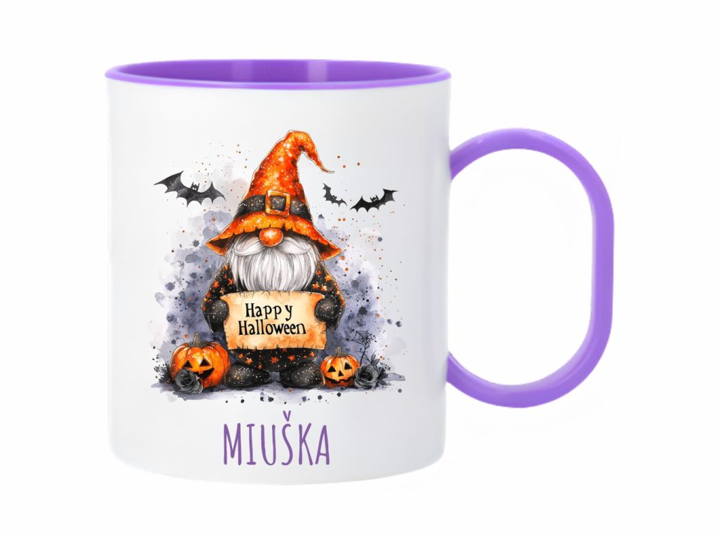 Veselý plastový hrnček s motívom trpaslíka v kúzelníckom klobúku a nápisom „Veselý Halloween“. Perfektný personalizovaný darček pre deti na oslavu Halloweenu.