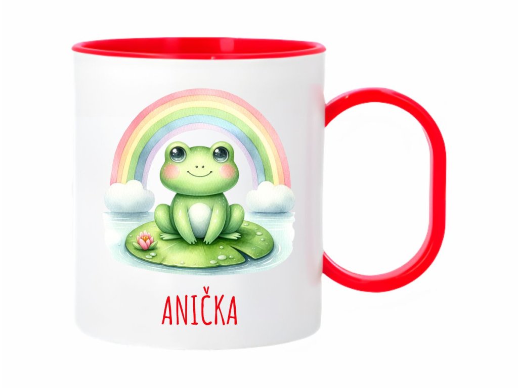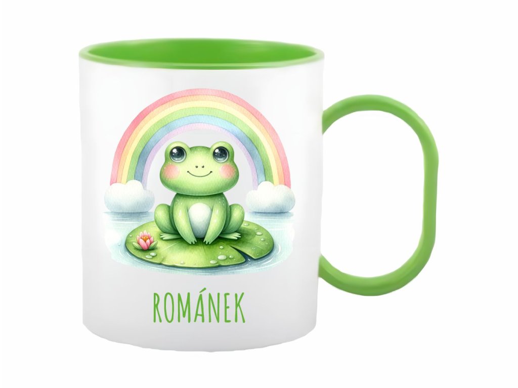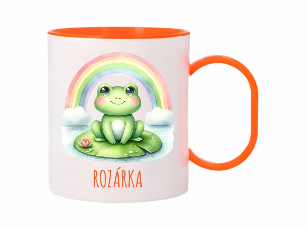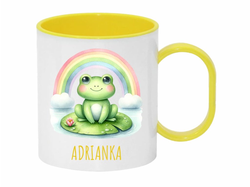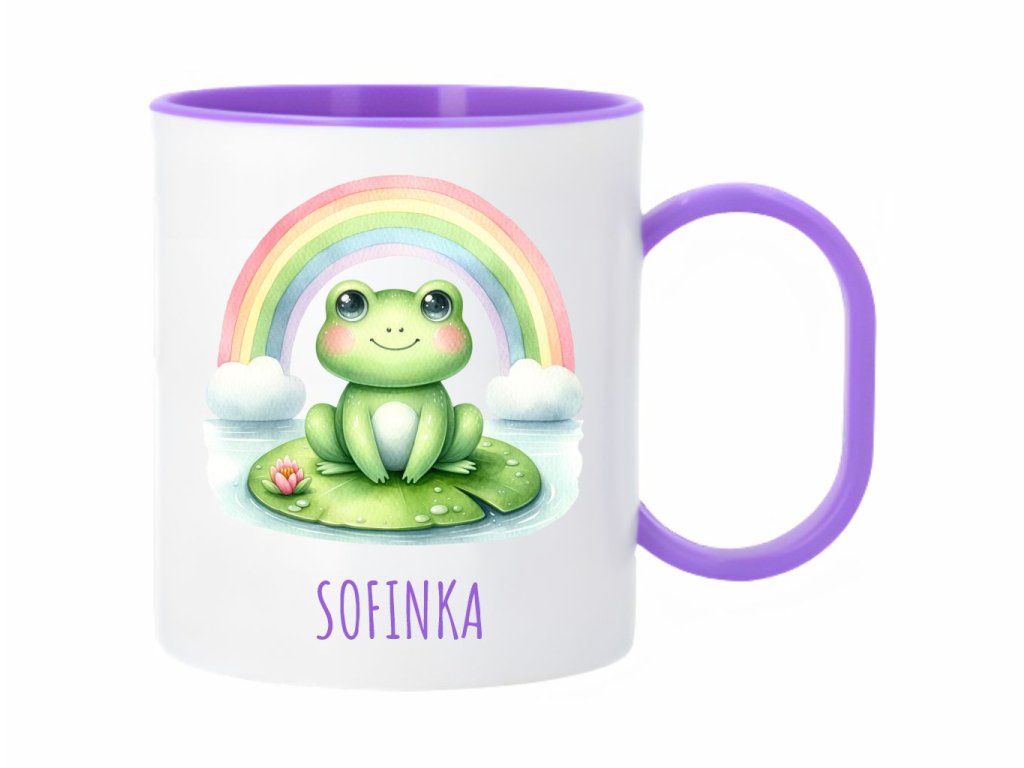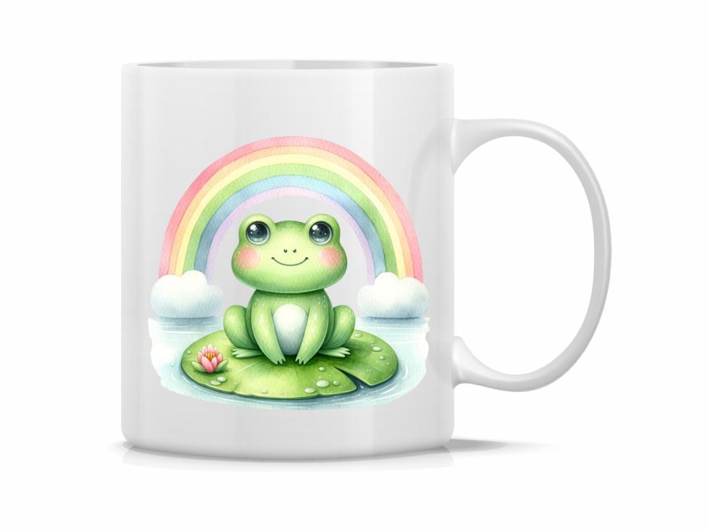Roztomilý plastový hrnček s motívom žabky na lekne a dúhy. Ideálny pre deti aj pre milovníkov prírody. Objem 300 ml.